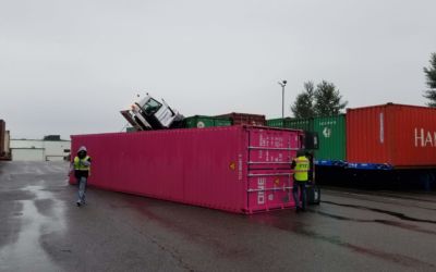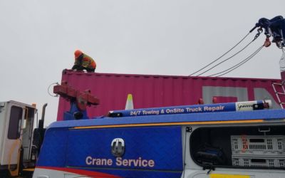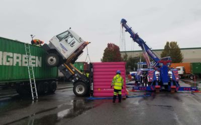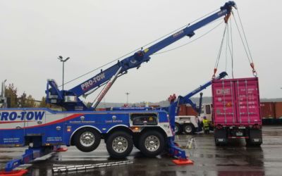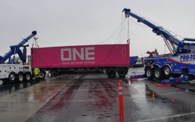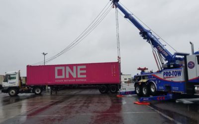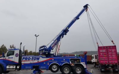 #teamprotow called on to perform an overhead lift for a semi-trailer heavily loaded with gravel that had become dislodged and jammed in the frame of the 2013 Peterbilt 378. #WSDOT Incident Response responded immediately to assist with lane closure and for quick clearance of the busy Issaquah section of I-90. After dislodging the semi-trailer from the Peterbilt, a replacement Freightliner was able to be successfully connected and the roadway fully opened.