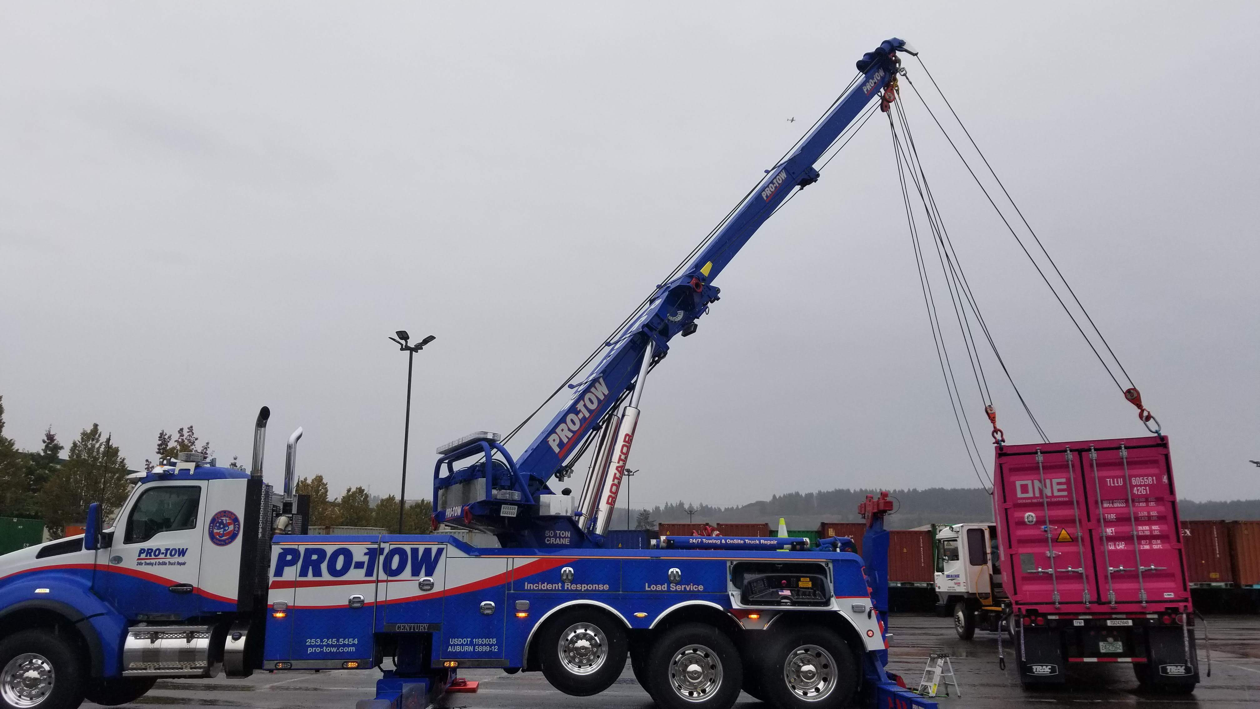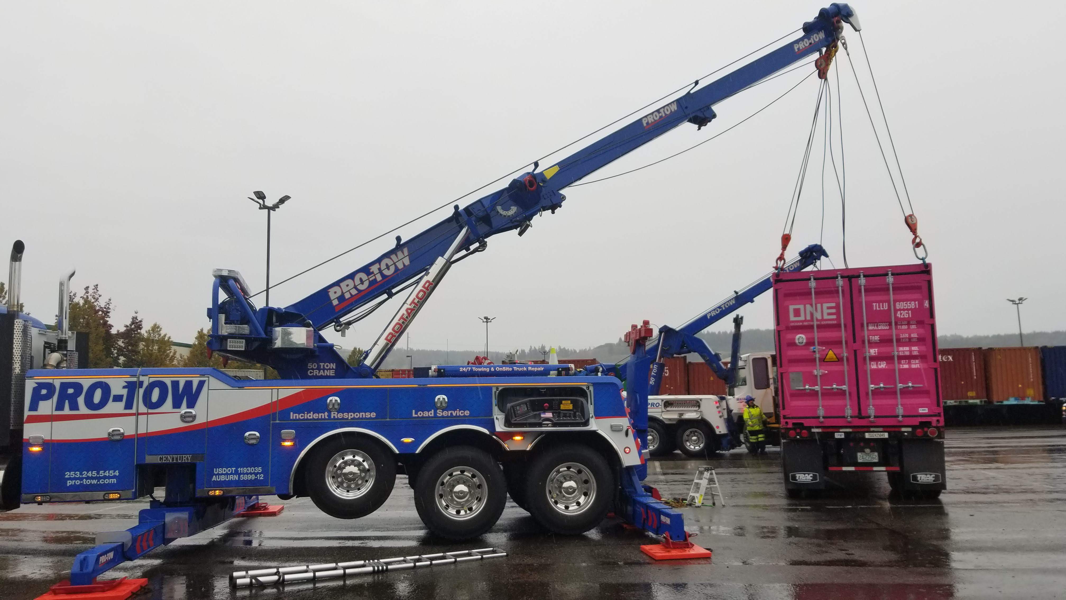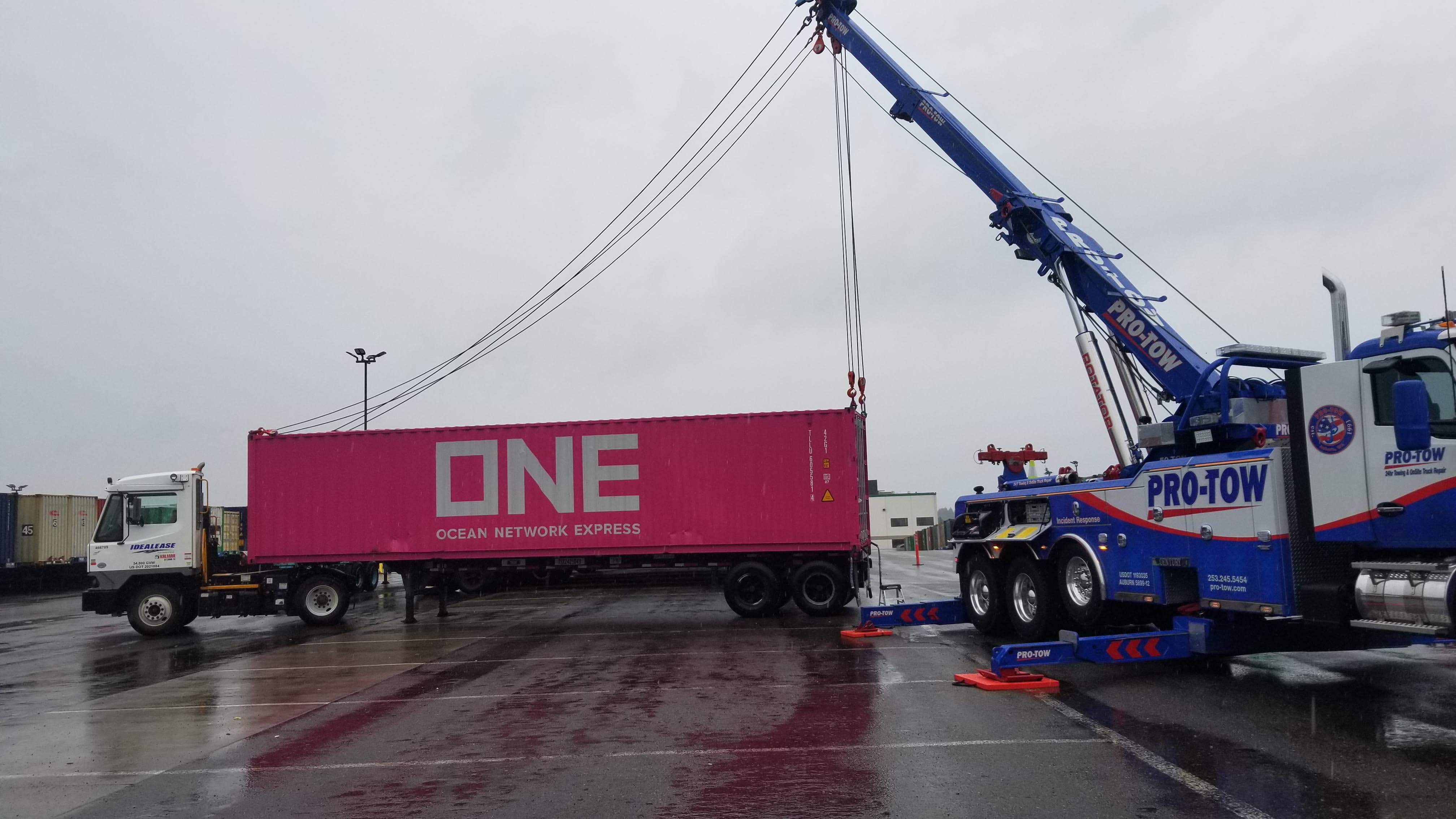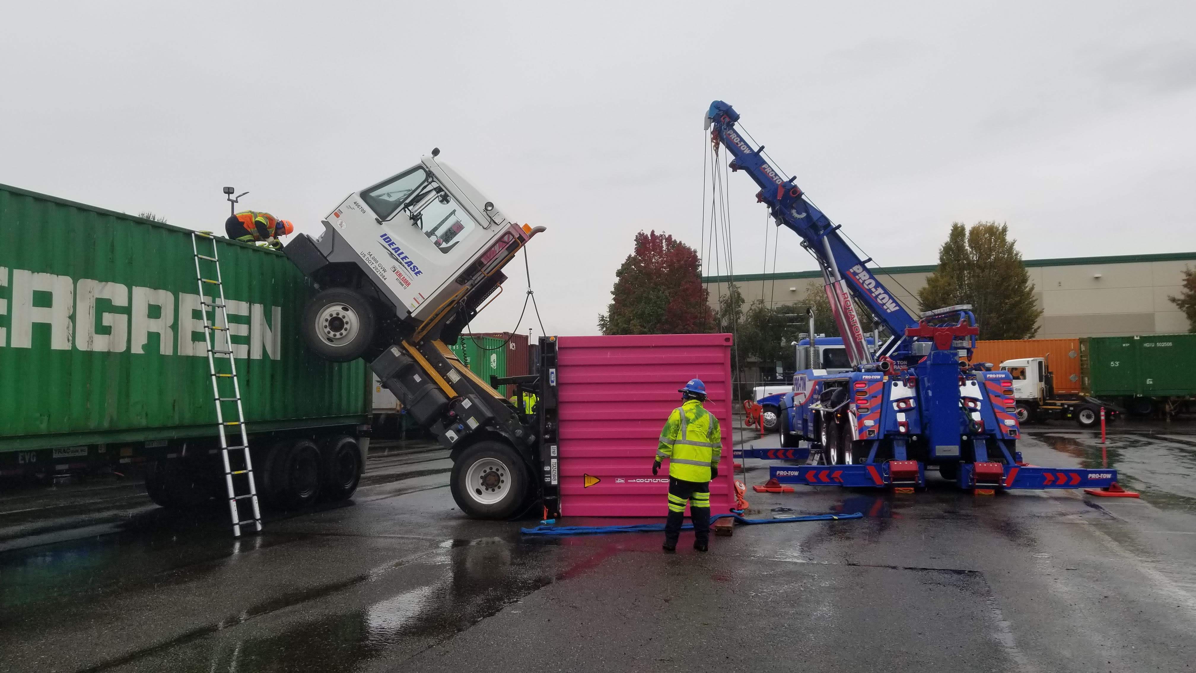 #teamprotow called on to perform an overhead lift for a semi-trailer heavily loaded with gravel that had become dislodged and jammed in the frame of the 2013 Peterbilt 378. #WSDOT Incident Response responded immediately to assist with lane closure and for quick clearance of the busy Issaquah section of I-90. After dislodging the semi-trailer from the Peterbilt, a replacement Freightliner was able to be successfully connected and the roadway fully opened.