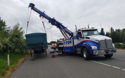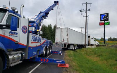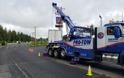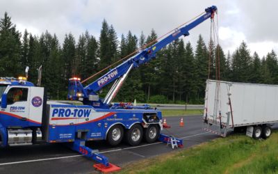 #teamprotow called on to perform an overhead lift for a semi-trailer heavily loaded with gravel that had become dislodged and jammed in the frame of the 2013 Peterbilt 378. #WSDOT Incident Response responded immediately to assist with lane closure and for quick clearance of the busy Issaquah section of I-90. After dislodging the semi-trailer from the Peterbilt, a replacement Freightliner was able to be successfully connected and the roadway fully opened.