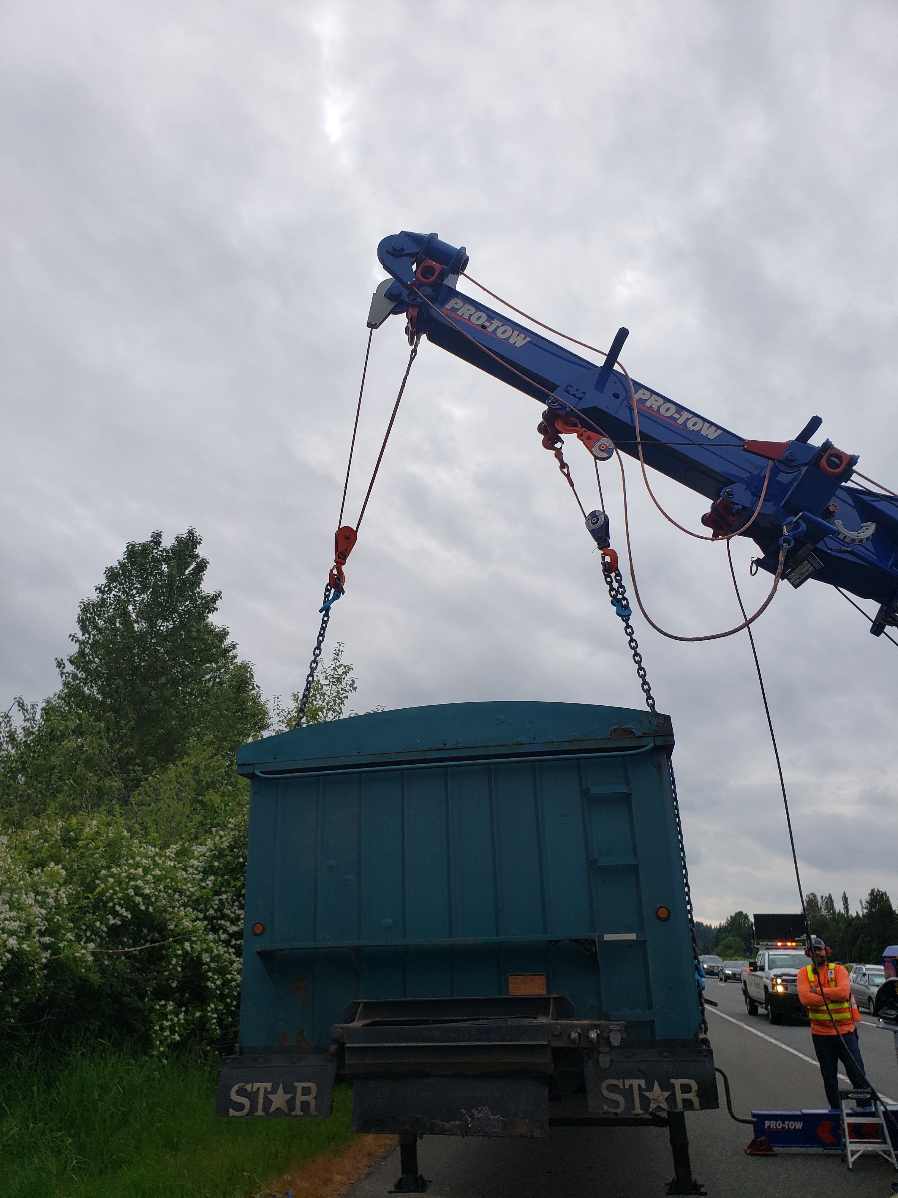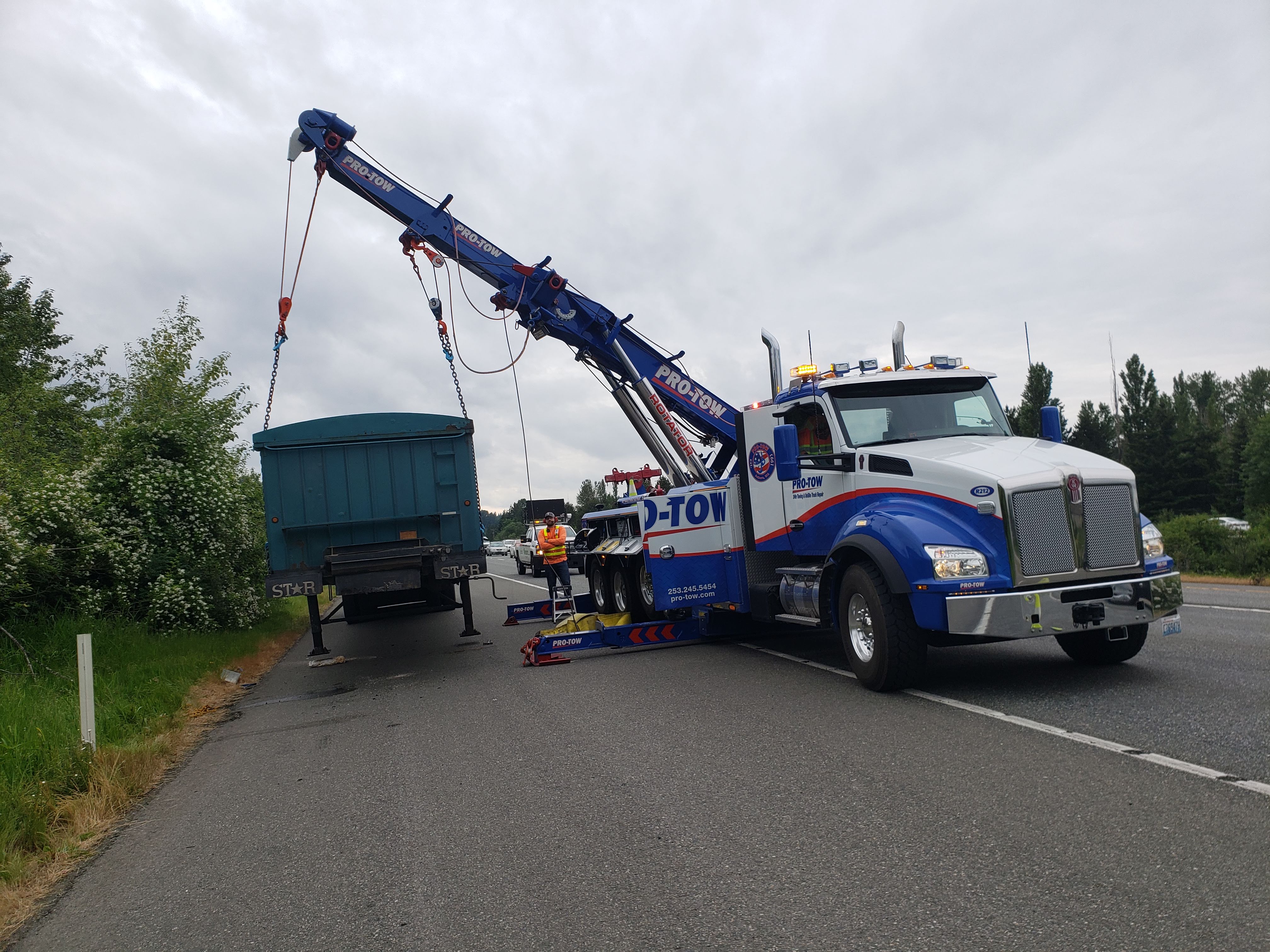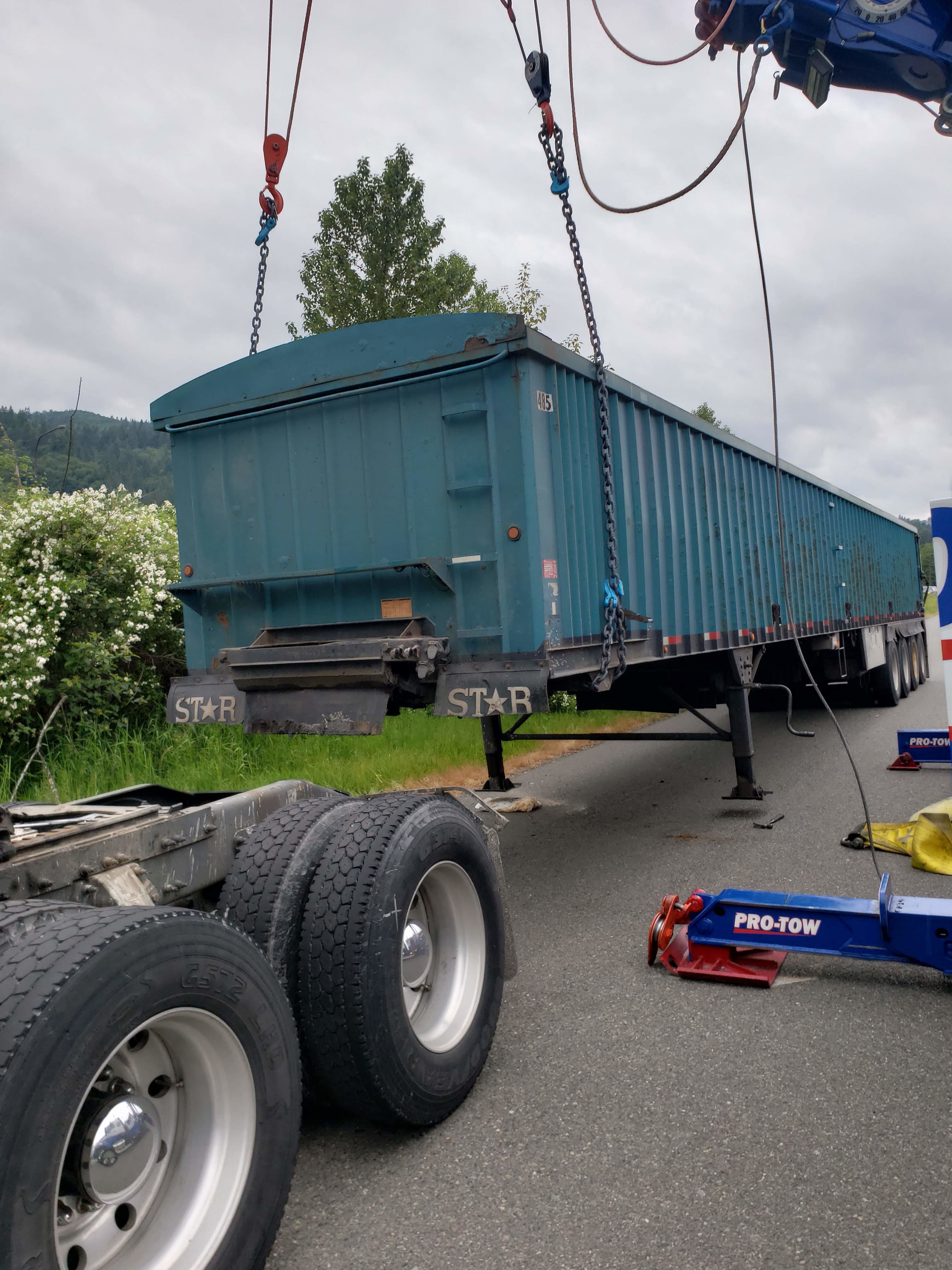 #teamprotow called on to perform an overhead lift for a semi-trailer heavily loaded with gravel that had become dislodged and jammed in the frame of the 2013 Peterbilt 378. #WSDOT Incident Response responded immediately to assist with lane closure and for quick clearance of the busy Issaquah section of I-90. After dislodging the semi-trailer from the Peterbilt, a replacement Freightliner was able to be successfully connected and the roadway fully opened.