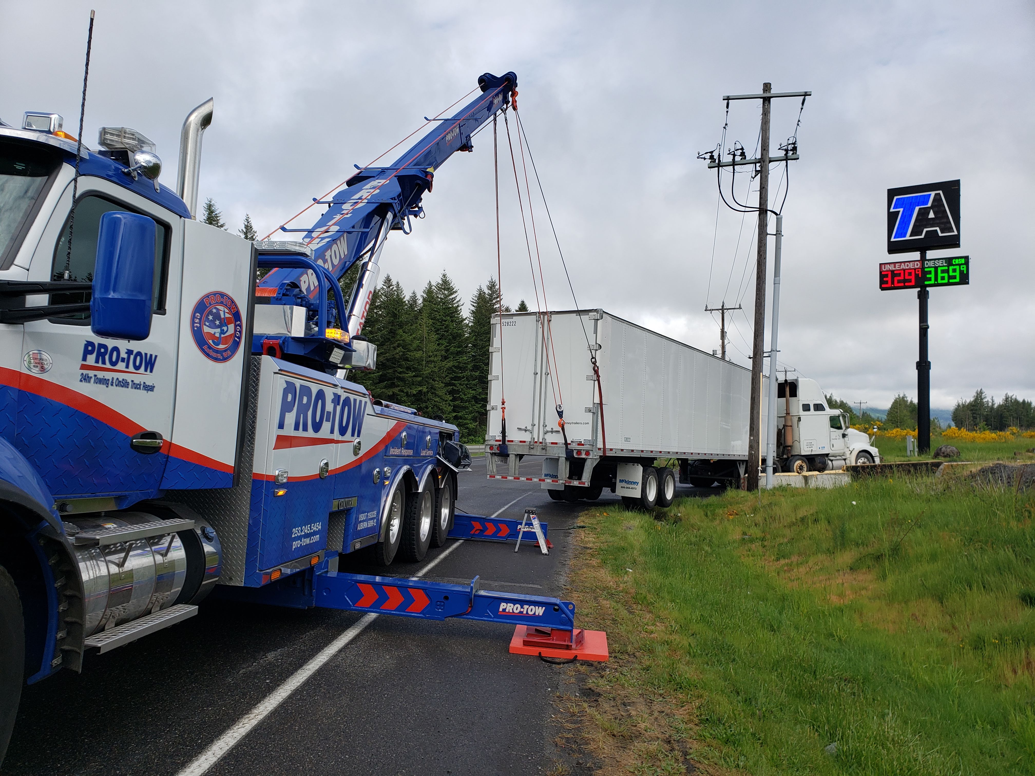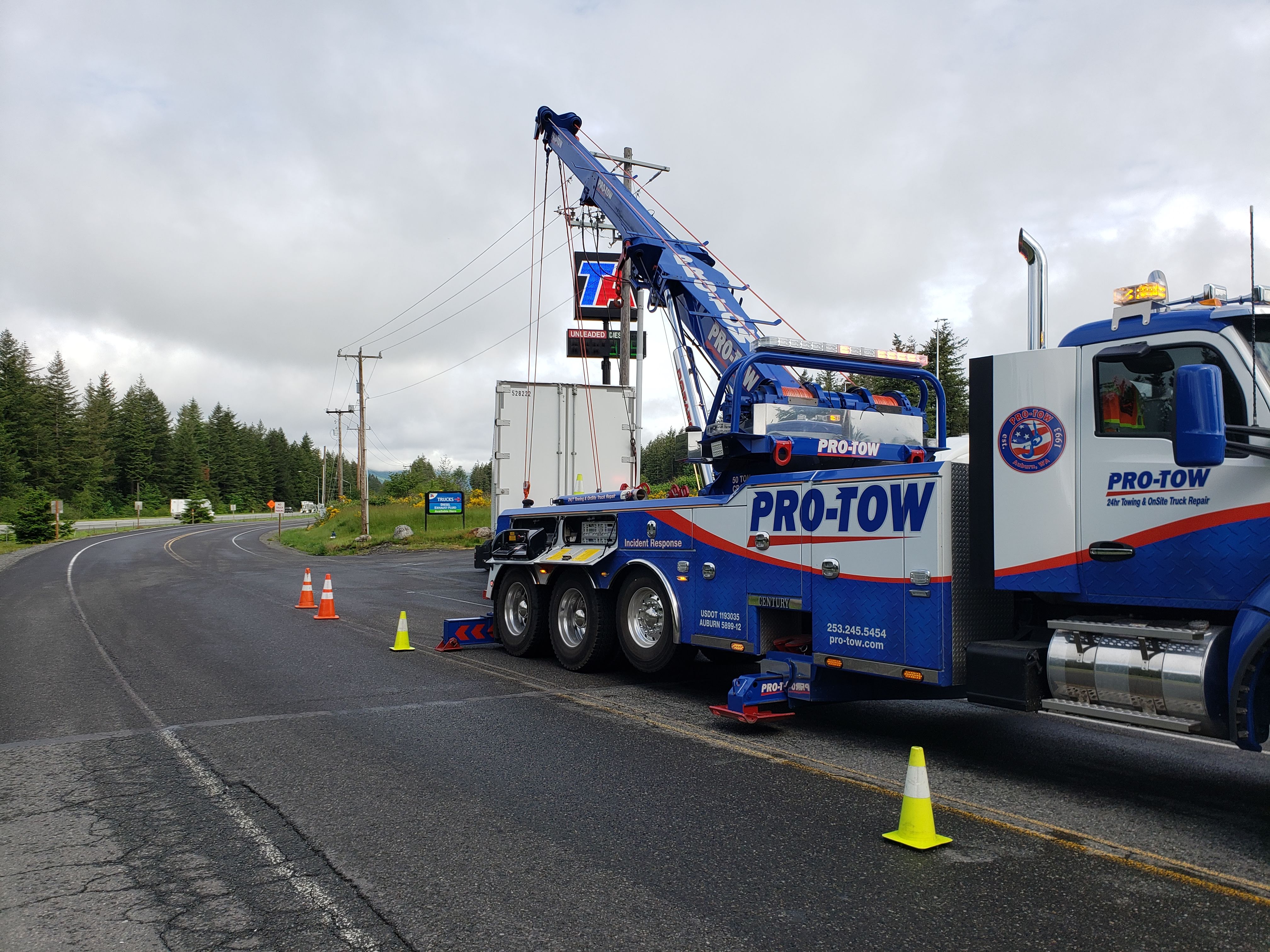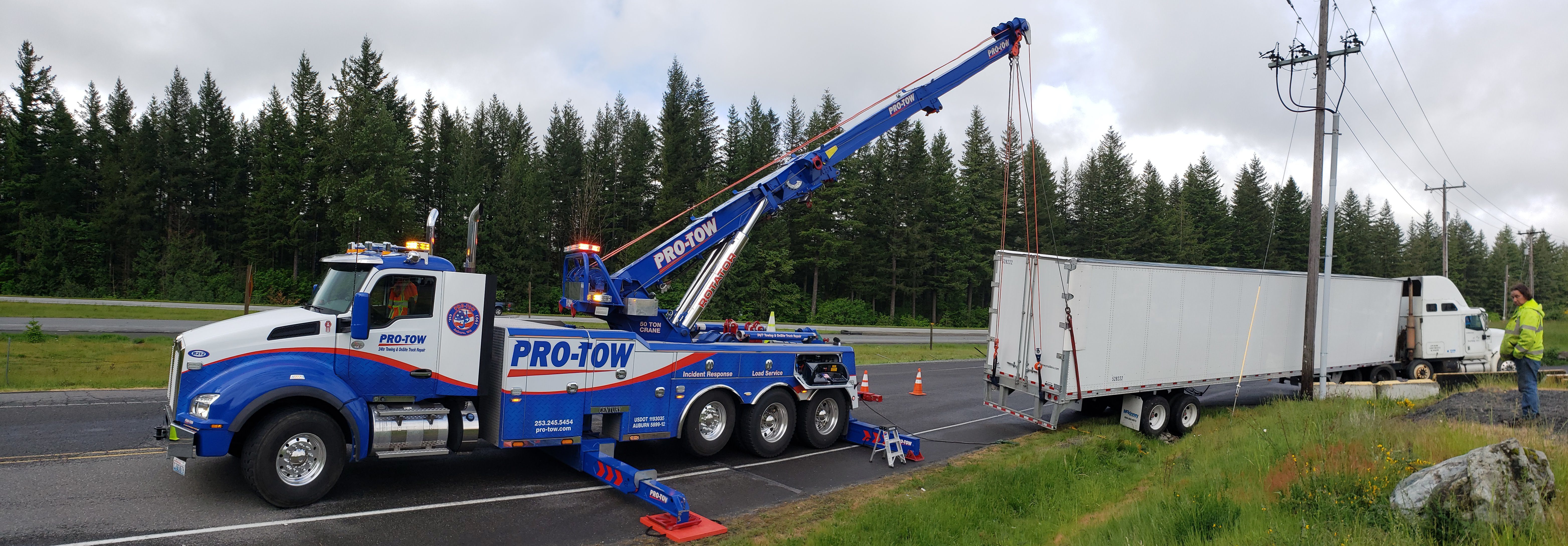 #teamprotow called on to perform an overhead lift for a semi-trailer heavily loaded with gravel that had become dislodged and jammed in the frame of the 2013 Peterbilt 378. #WSDOT Incident Response responded immediately to assist with lane closure and for quick clearance of the busy Issaquah section of I-90. After dislodging the semi-trailer from the Peterbilt, a replacement Freightliner was able to be successfully connected and the roadway fully opened.