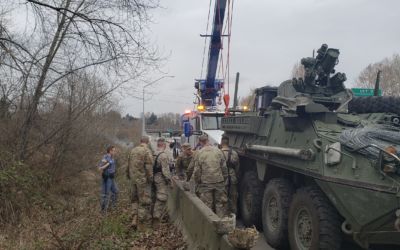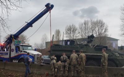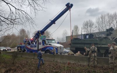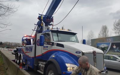 A box truck flipped over and landed itself in a creek. When it came off the road, the front end became wedged against a large bush, contorting the box and damaging the connection between the box and the truck itself. This truck accident recovery required a full crane lift to fish it out of the creek. Watch the video to see how we lifted the box and truck with our new crane. It did feel a lot like fishing, and we caught ourselves a big one.