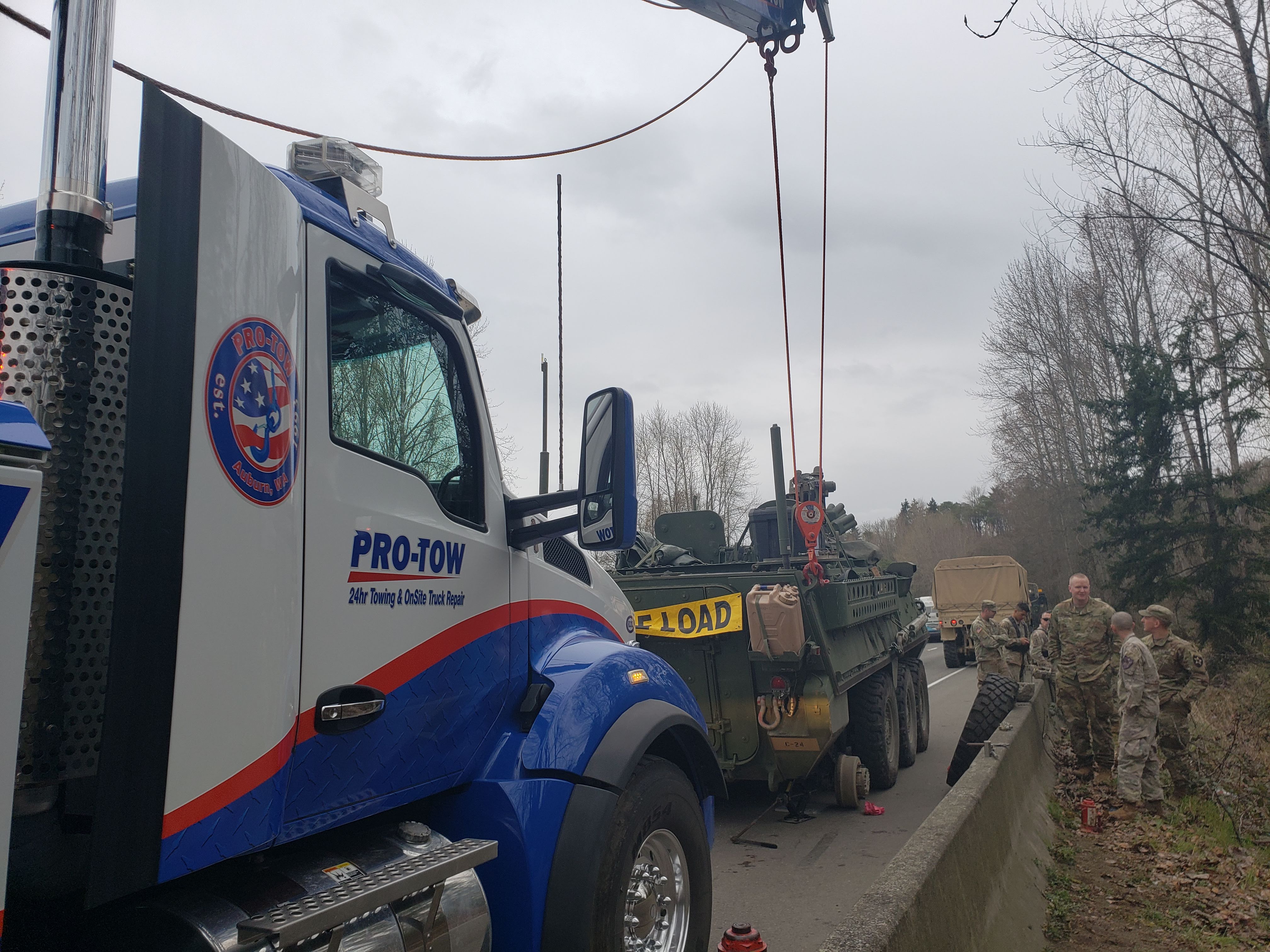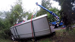 A box truck flipped over and landed itself in a creek. When it came off the road, the front end became wedged against a large bush, contorting the box and damaging the connection between the box and the truck itself. This truck accident recovery required a full crane lift to fish it out of the creek. Watch the video to see how we lifted the box and truck with our new crane. It did feel a lot like fishing, and we caught ourselves a big one.