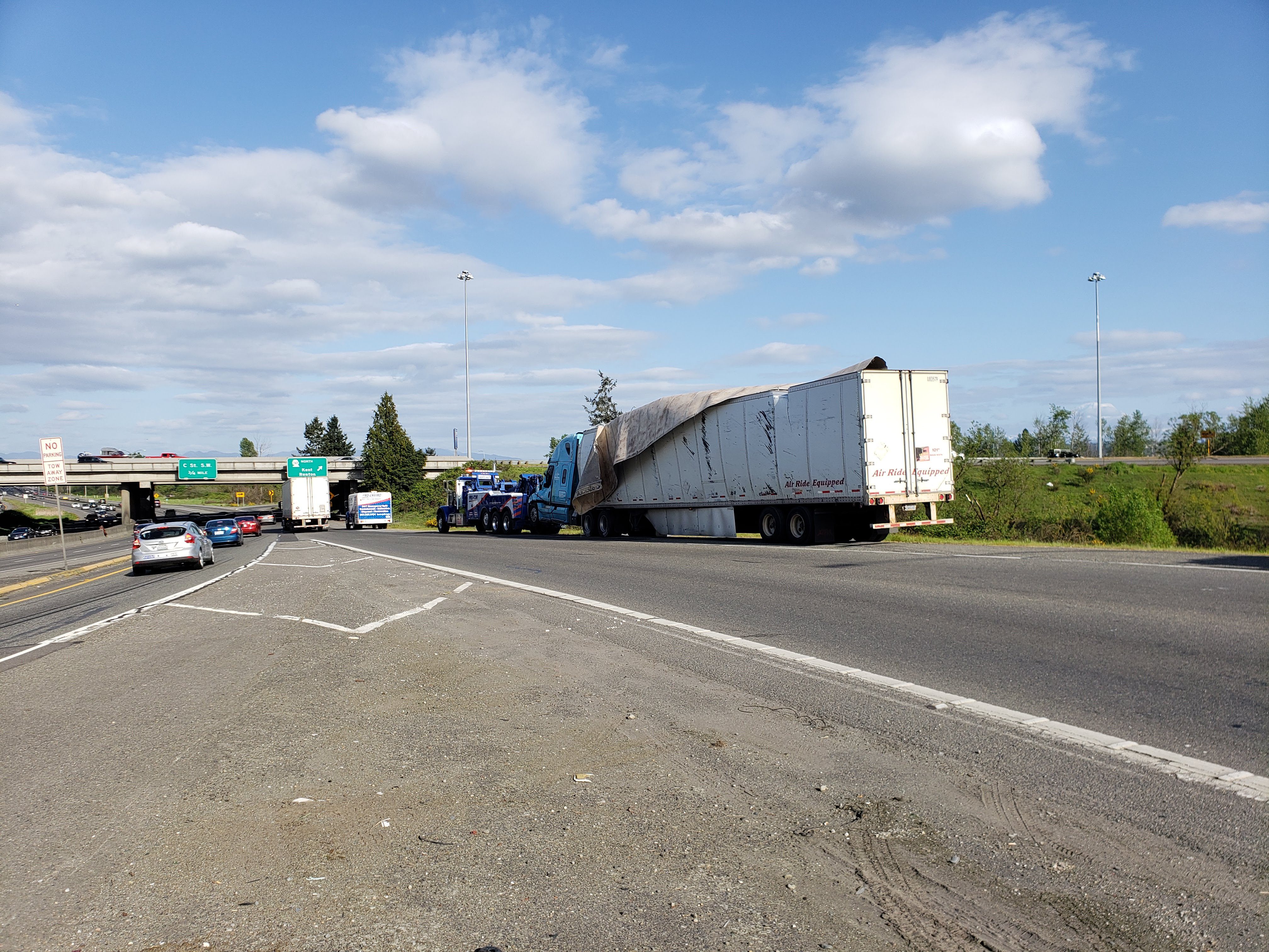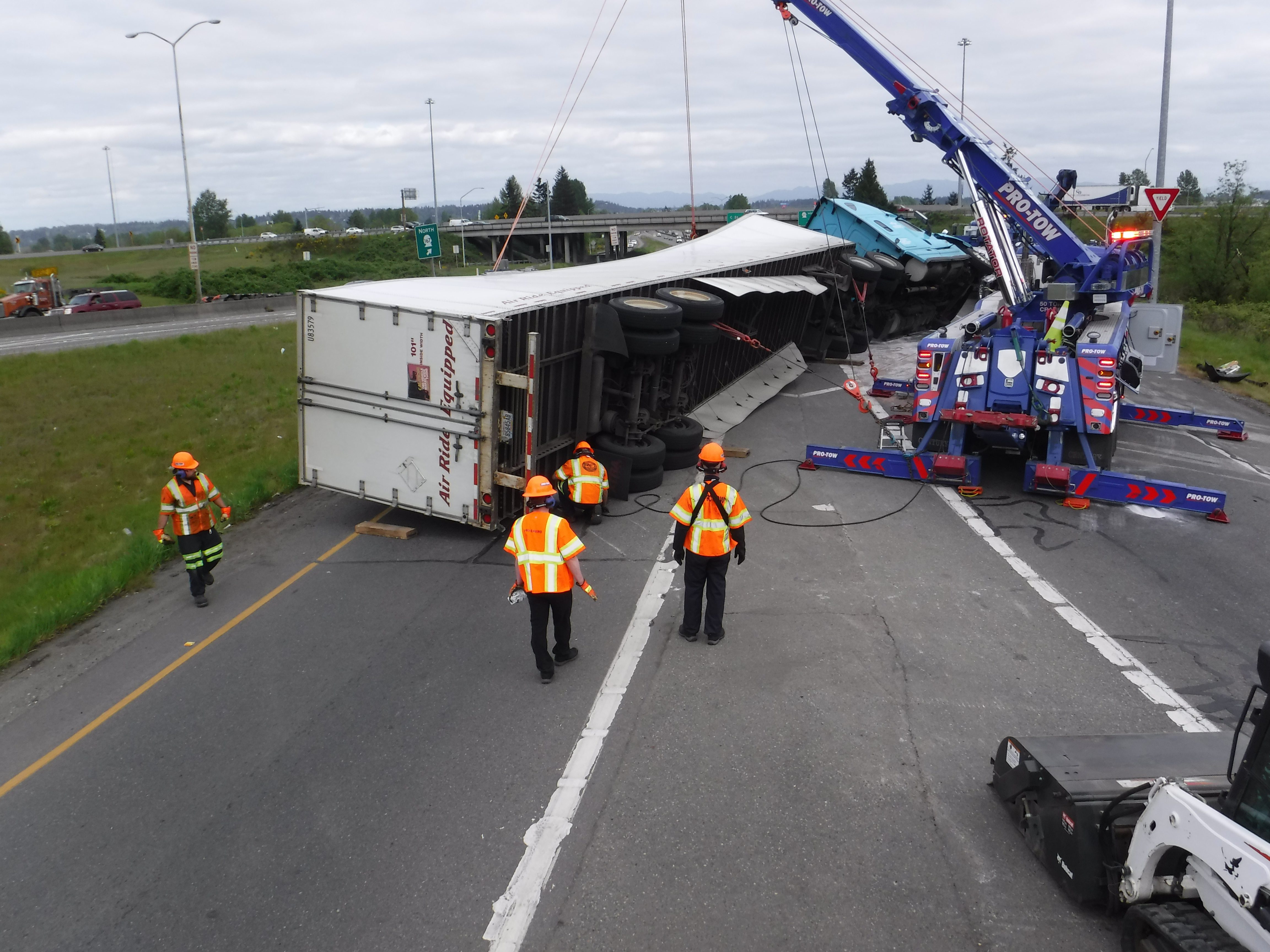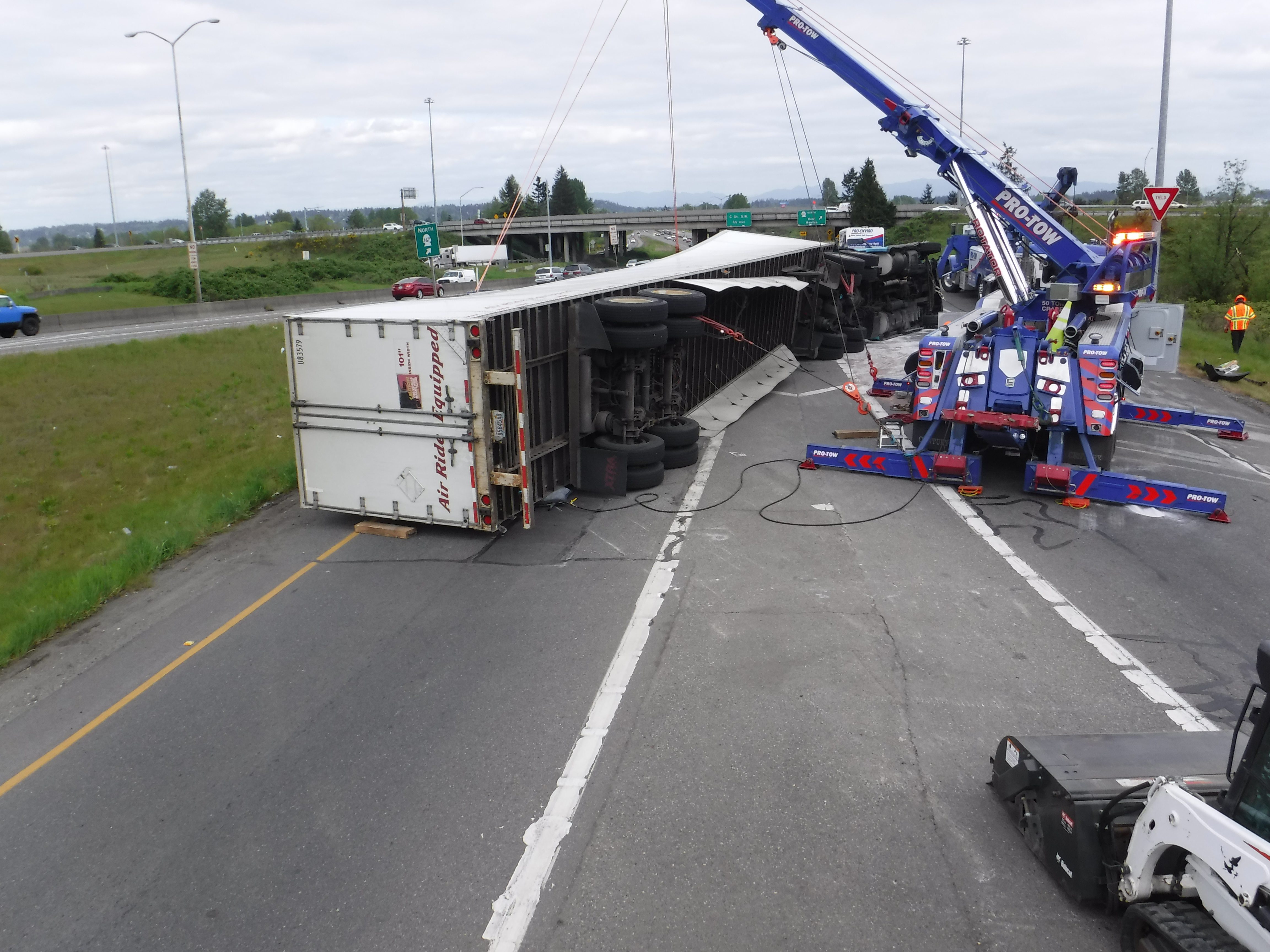 #teamprotow called on to clear a semi-truck accident in Auburn, WA after it overturns during the afternoon commute snarling traffic. The truck was carrying a full load of steel and weighed more than 70,000lbs, and complicating the recovery was diesel and other motor vehicle fluids that needed to be quickly cleaned to prevent runoff to the nearby storm water collection sites. WSDOT, WSP, and Valley Regional Fire were on scene to assist with coordination in what WSDOT termed a Major Incident Tow and activating an enhanced quick clearance protocol. Fortunately, nobody was seriously hurt and the recovery was quickly cleared and the motor vehicle fluid spill was cleaned preventing other mitigation requirements.