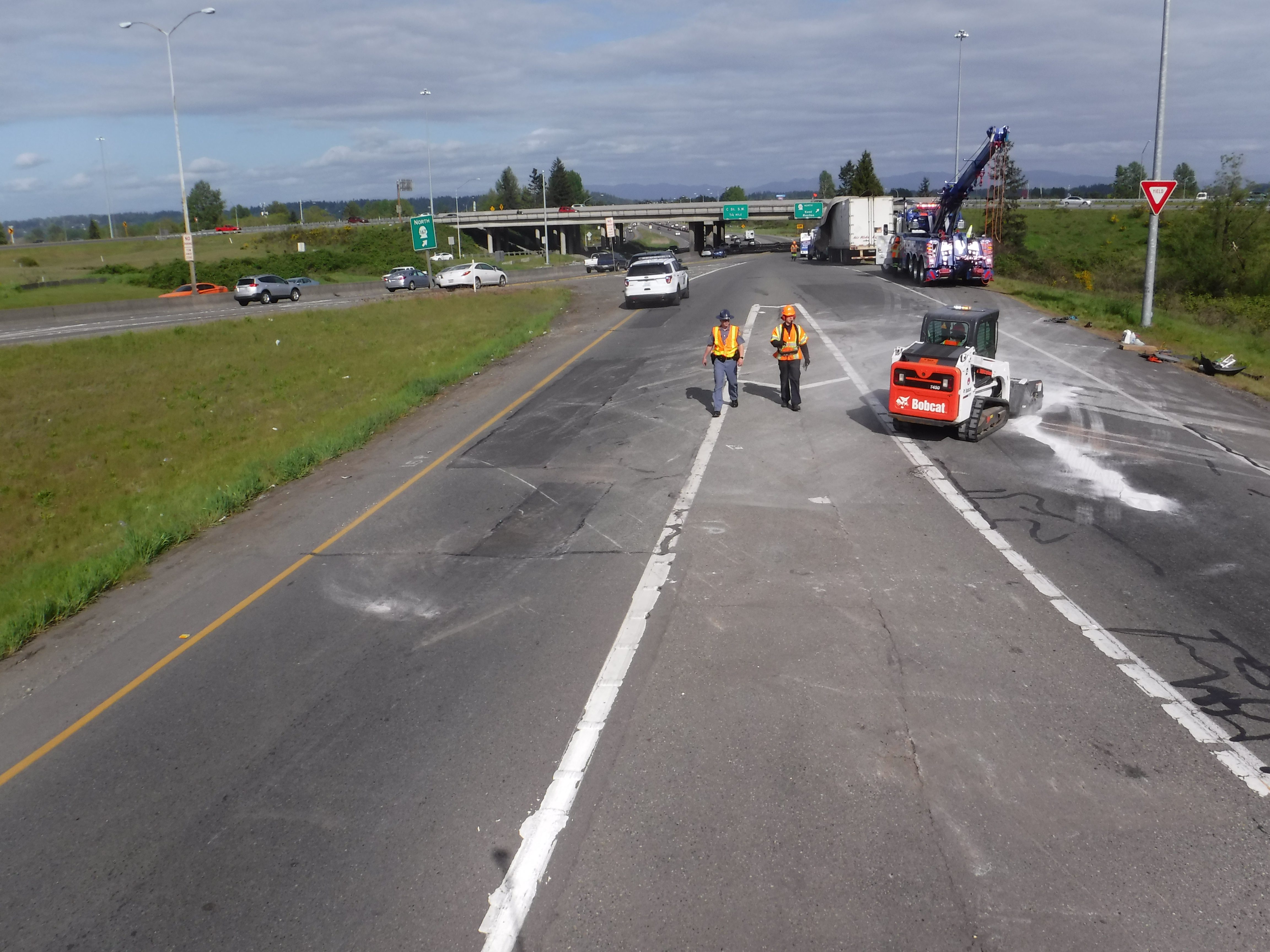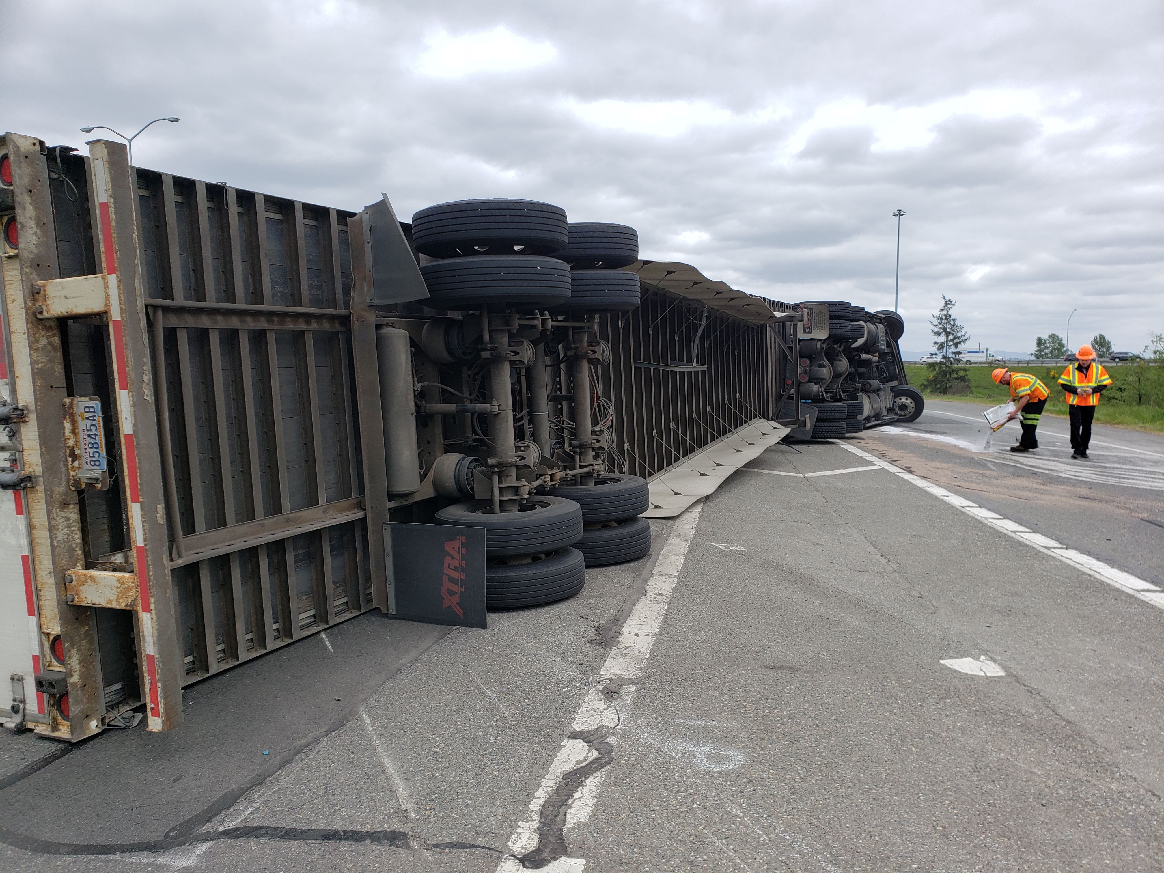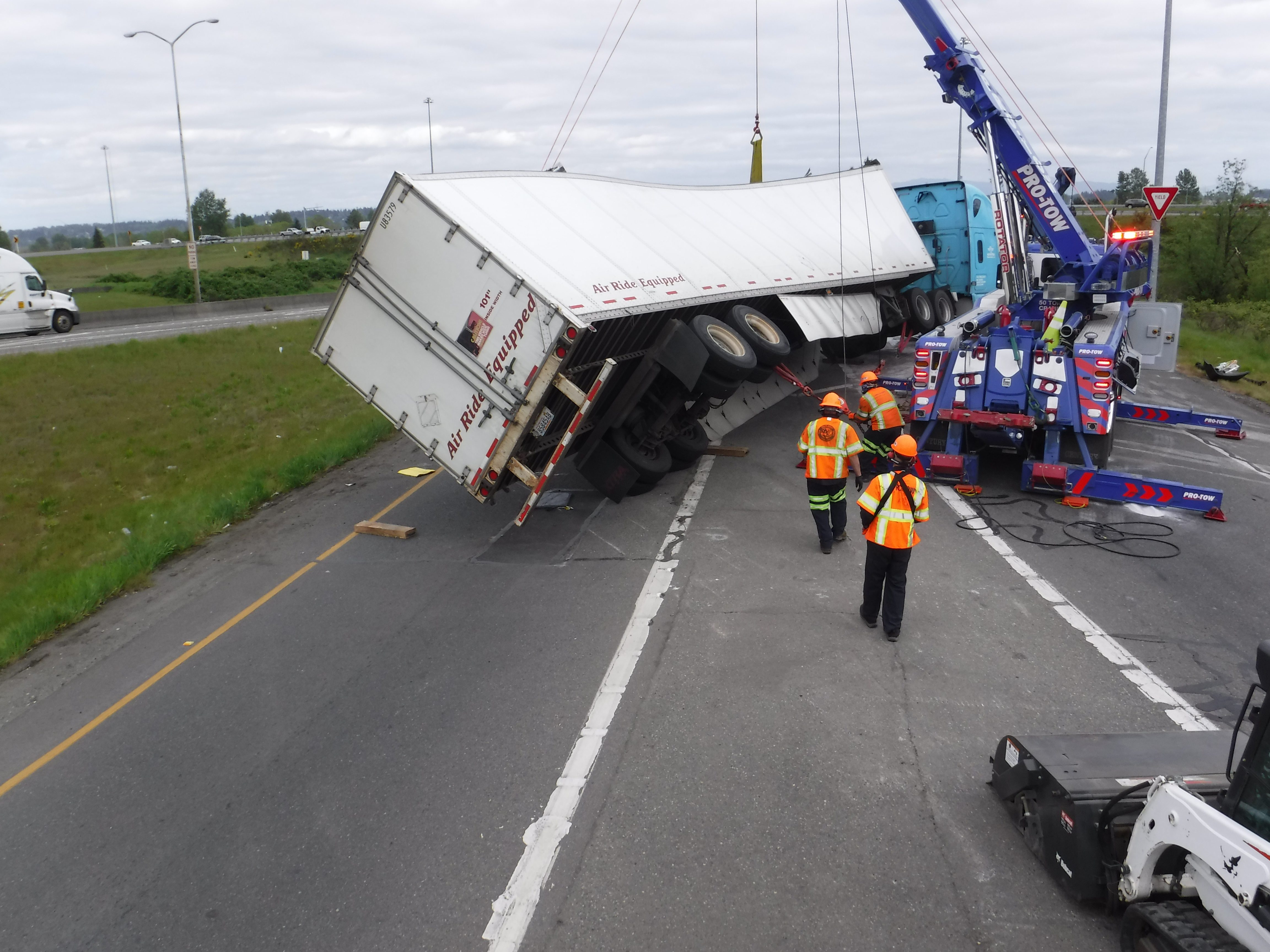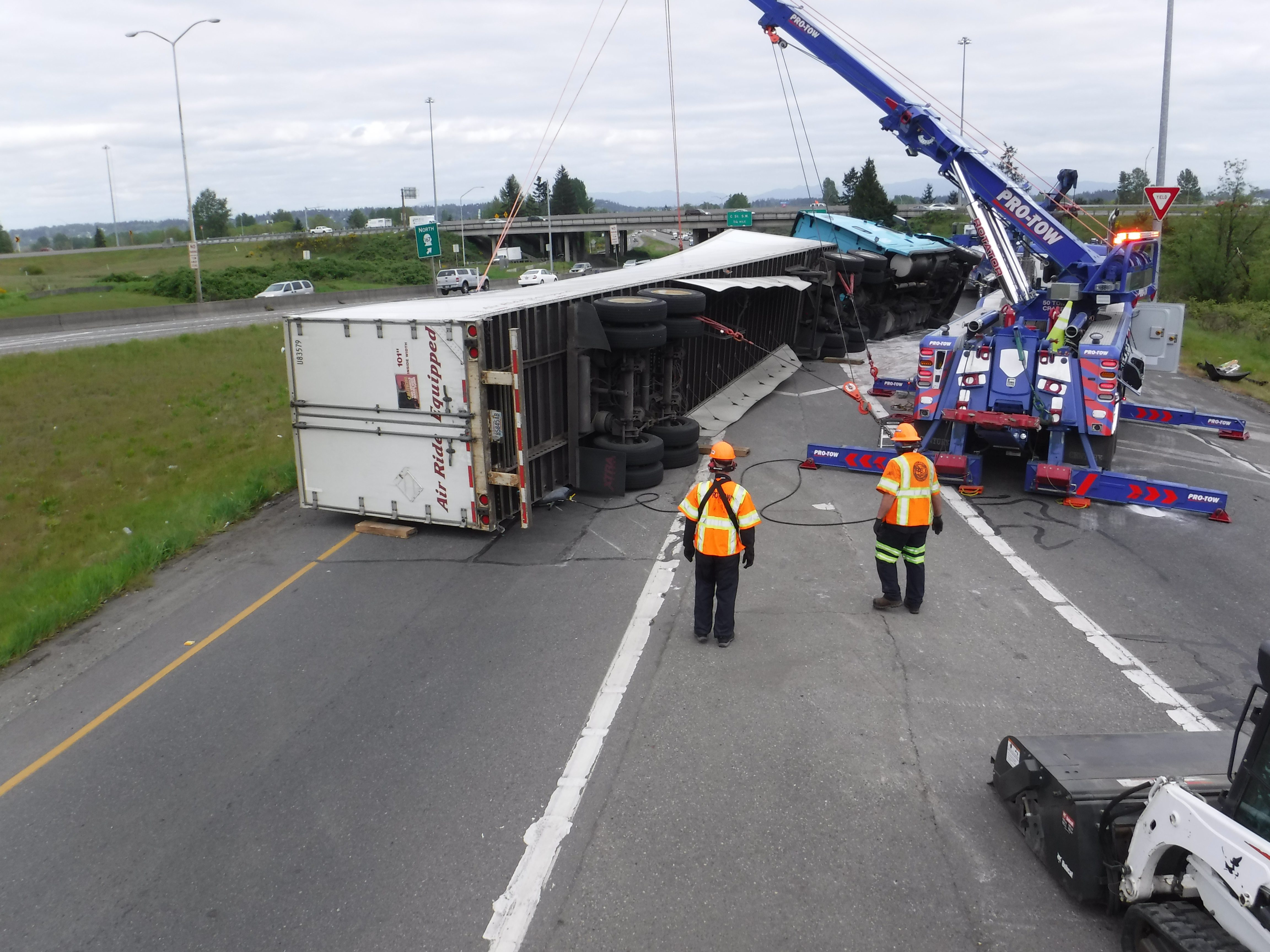 #teamprotow called on to clear a semi-truck accident in Auburn, WA after it overturns during the afternoon commute snarling traffic. The truck was carrying a full load of steel and weighed more than 70,000lbs, and complicating the recovery was diesel and other motor vehicle fluids that needed to be quickly cleaned to prevent runoff to the nearby storm water collection sites. WSDOT, WSP, and Valley Regional Fire were on scene to assist with coordination in what WSDOT termed a Major Incident Tow and activating an enhanced quick clearance protocol. Fortunately, nobody was seriously hurt and the recovery was quickly cleared and the motor vehicle fluid spill was cleaned preventing other mitigation requirements.