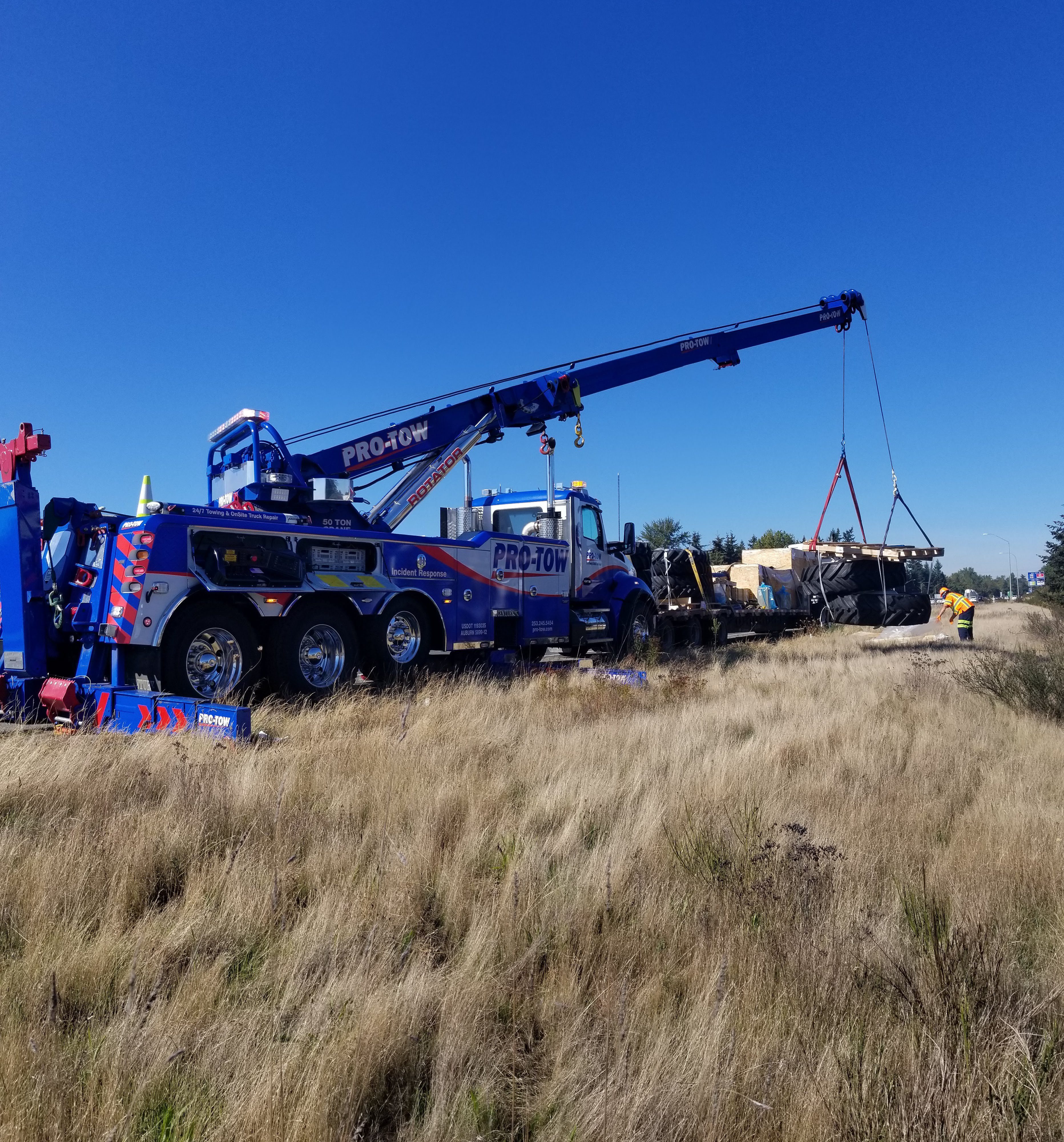 Team Pro-Tow decided to use our top-of-the-line Century Rotator to get this truck unstuck. A tow truck equipped with this rotator was the best choice because it could carefully and safely get this truck out, without damaging either the truck or slightly twisted trailer. After making a plan for recovery, we were able to remove the truck from its muddy prison and get it back on its route.