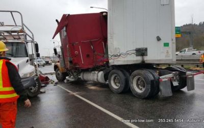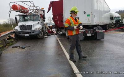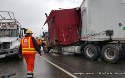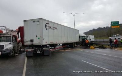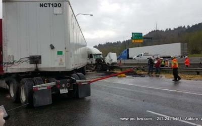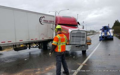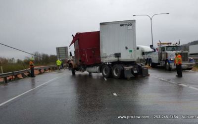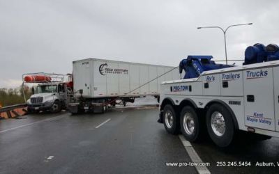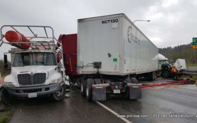 #teamprotow called on to get stuck 2016 International ProStar out of the delivery driveway in Federal Way, WA. The tow truck recovery was complicated by a 12% grade, a steep embankment on the passenger side, as well as a busy residential street. Utilizing a heavy duty rotating crane style wrecker from Miller, #teamprotow was able to winch the ProStar to the top of the hill as well as move it sideways in one motion–all while the roadway remained open. Successful, with no additional damage.