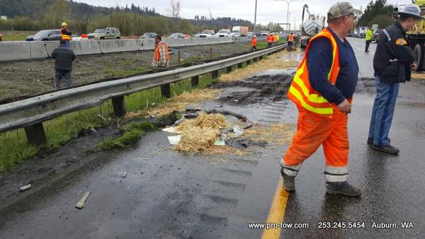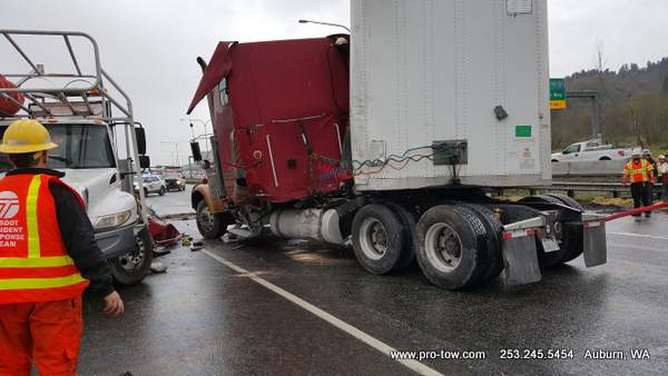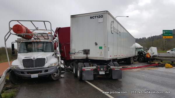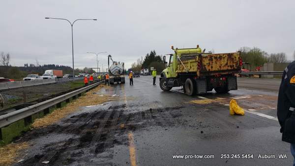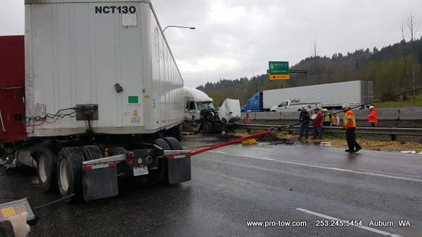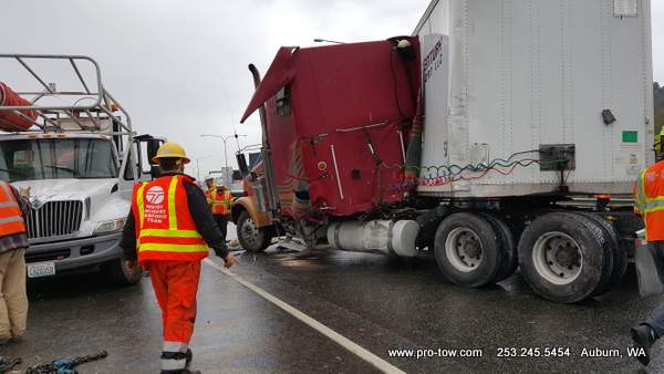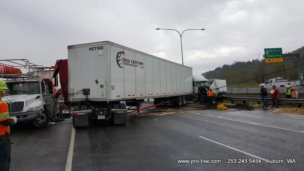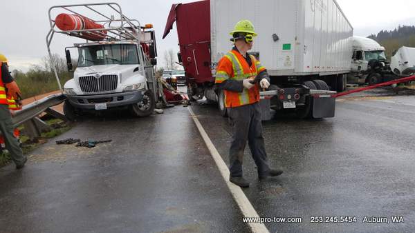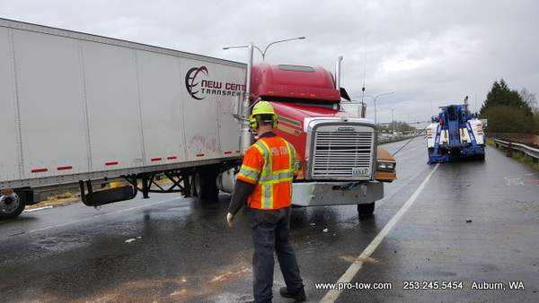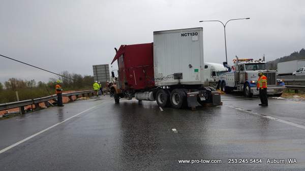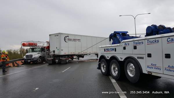#teamprotow called on to get stuck 2016 International ProStar out of the delivery driveway in Federal Way, WA. The tow truck recovery was complicated by a 12% grade, a steep embankment on the passenger side, as well as a busy residential street. Utilizing a heavy duty rotating crane style wrecker from Miller, #teamprotow was able to winch the ProStar to the top of the hill as well as move it sideways in one motion–all while the roadway remained open. Successful, with no additional damage.
