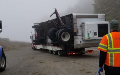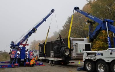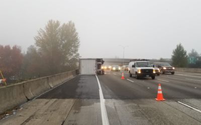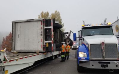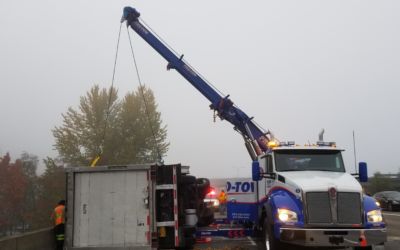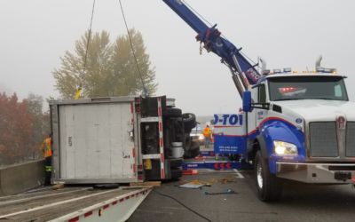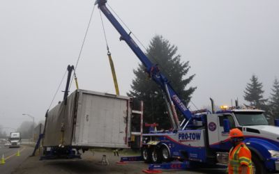 After a loaded semi trailer flips over and blocking Northbound I-5 just South of Seattle, WA in Tukwila, #teamprotow called with their incident response team to clear the highway during a busy Monday morning commute. Working closely with the Washington State Patrol and the Washington State Department of Transportation quick clearance program, the highway was reopened for all lanes of travel in hour of great teamwork. Utilizing a heavy duty rotating crane style wrecker along with additional incident response vehicles and a team of certified recovery personnel, the load of milk and dairy products was quickly cleaned with minimal lane closure. Pro-Tow is a locally owned towing company specializing in unique and difficult jobs that require special equipment and highly trained personnel capable of solving the most challenging situations quickly and with minimizing other impacts. Pro-Tow is based out of Auburn, WA, but serves all the Northwest states.