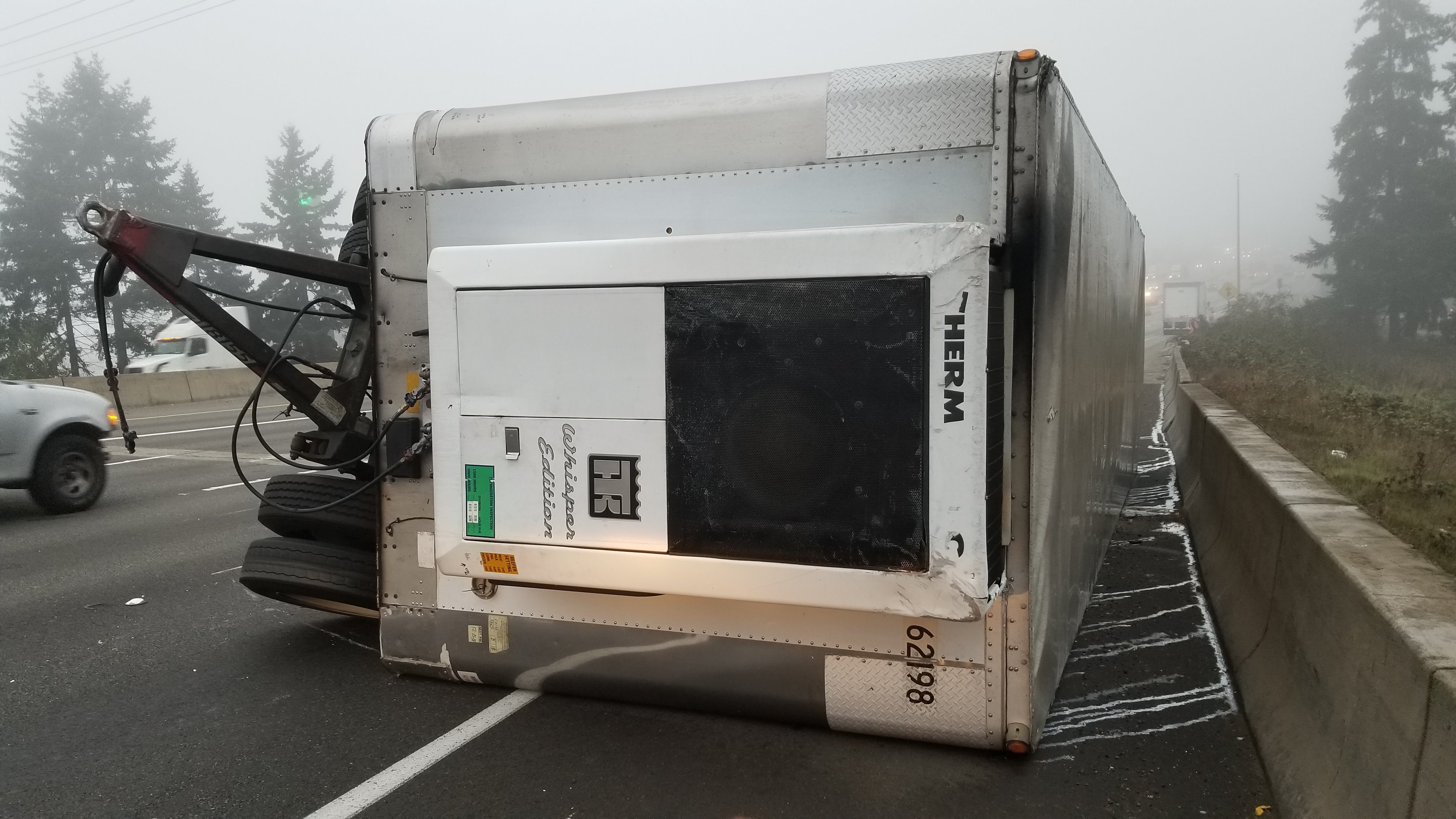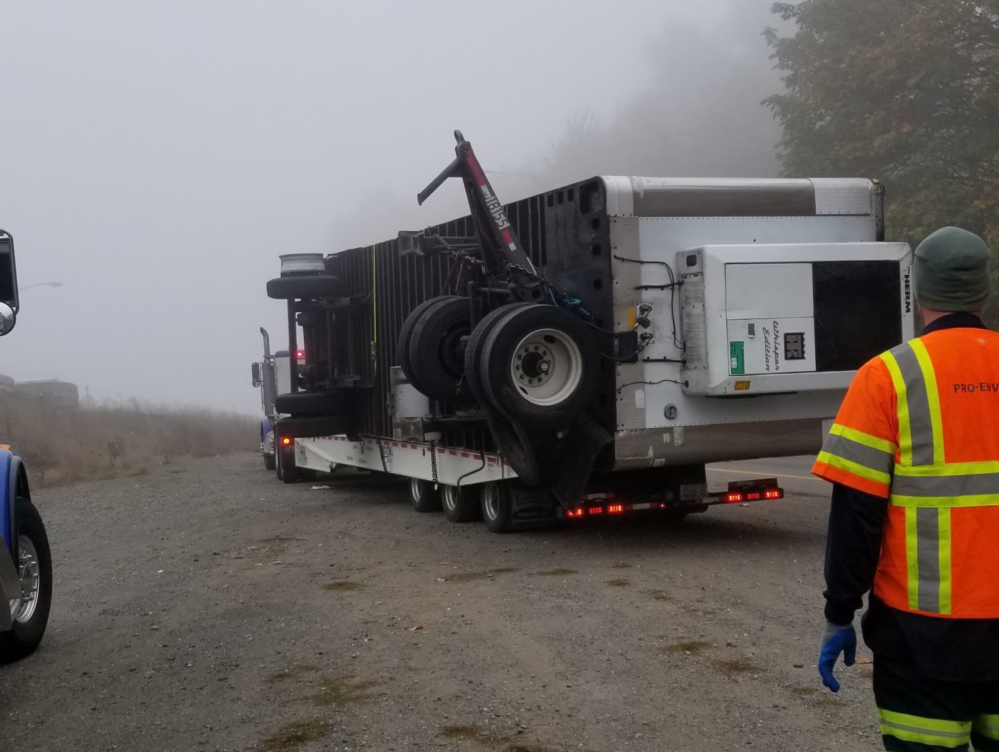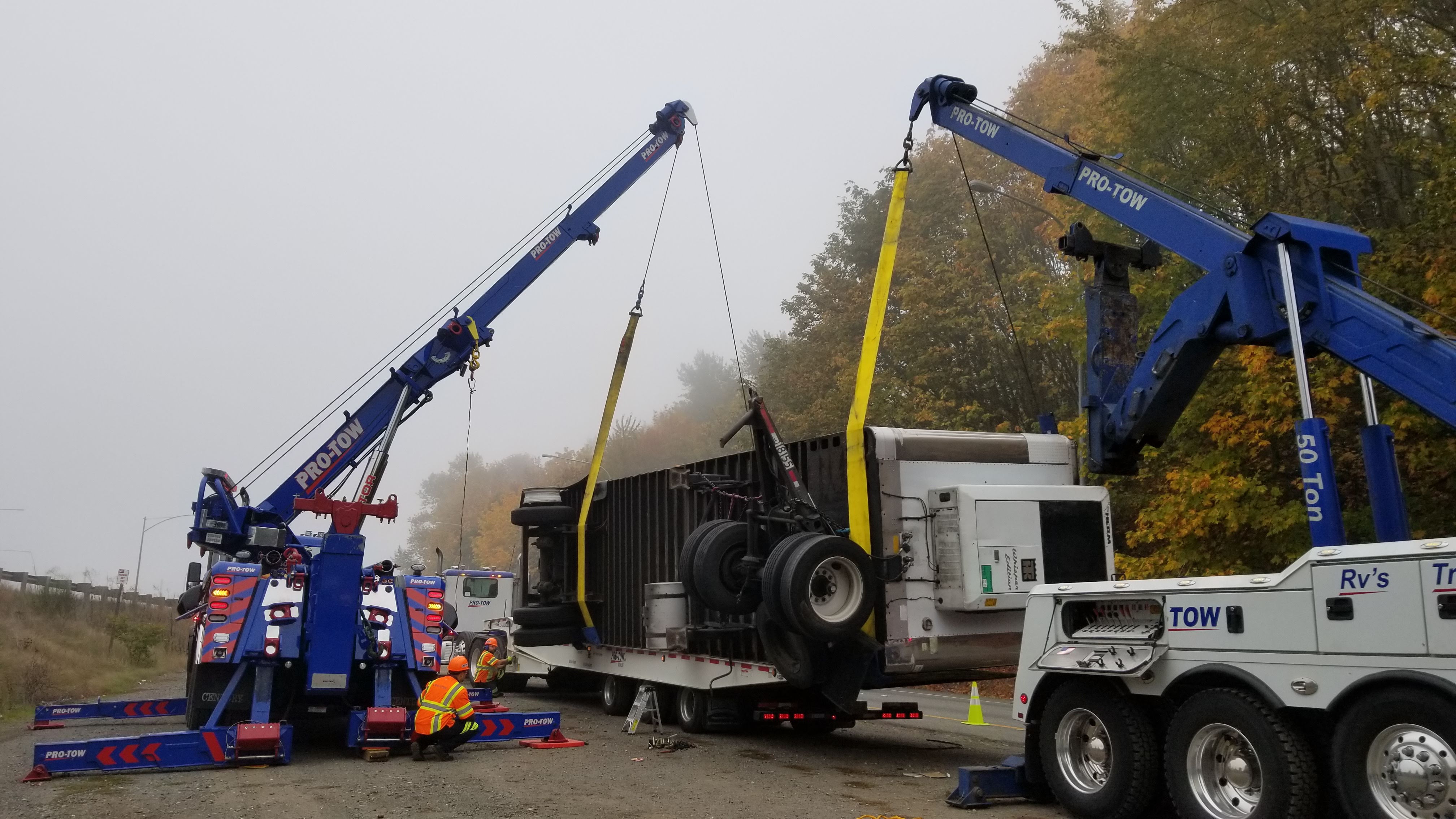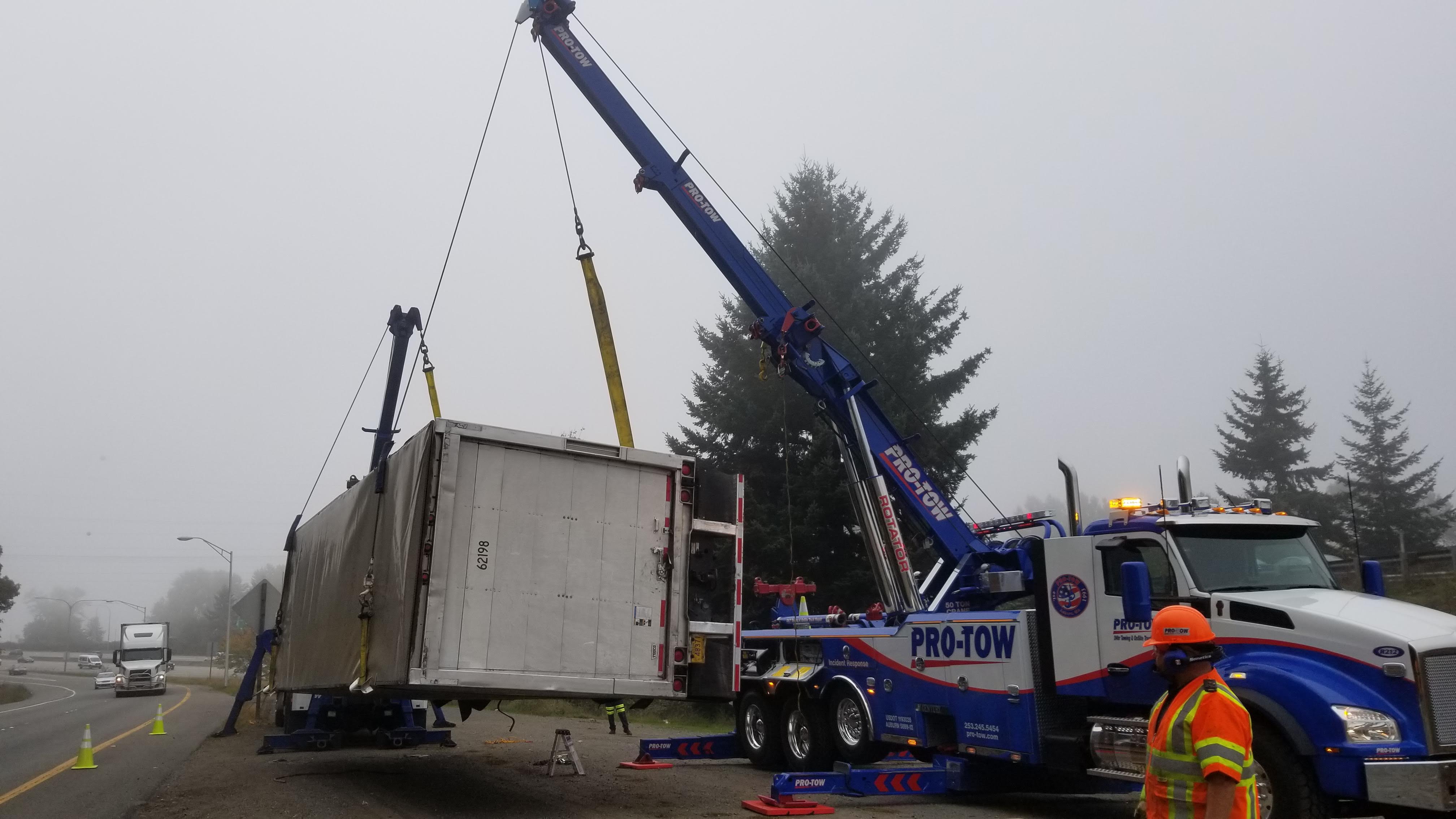 After a loaded semi trailer flips over and blocking Northbound I-5 just South of Seattle, WA in Tukwila, #teamprotow called with their incident response team to clear the highway during a busy Monday morning commute. Working closely with the Washington State Patrol and the Washington State Department of Transportation quick clearance program, the highway was reopened for all lanes of travel in hour of great teamwork. Utilizing a heavy duty rotating crane style wrecker along with additional incident response vehicles and a team of certified recovery personnel, the load of milk and dairy products was quickly cleaned with minimal lane closure. Pro-Tow is a locally owned towing company specializing in unique and difficult jobs that require special equipment and highly trained personnel capable of solving the most challenging situations quickly and with minimizing other impacts. Pro-Tow is based out of Auburn, WA, but serves all the Northwest states.