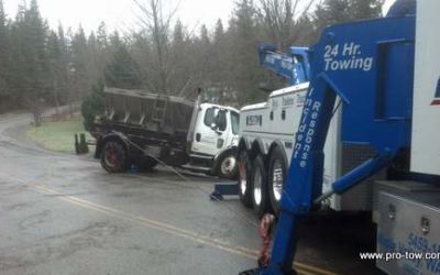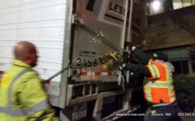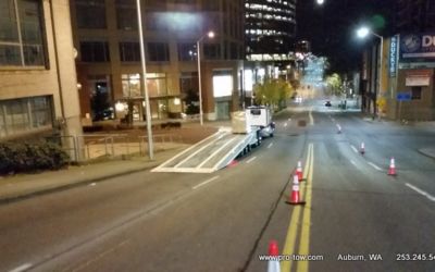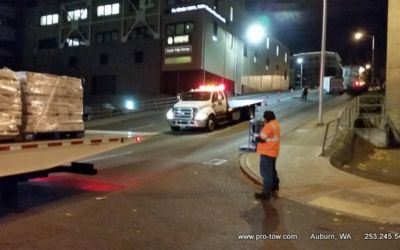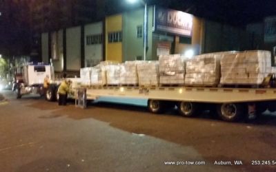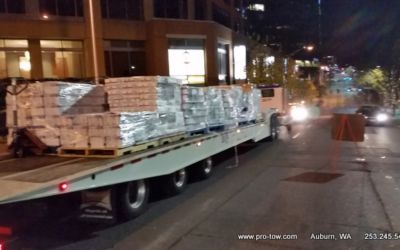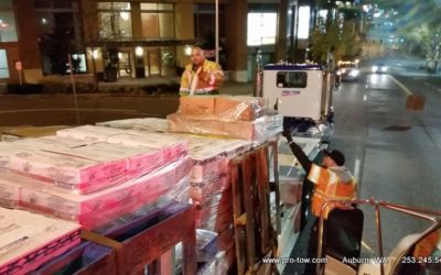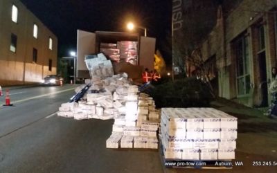 Seafood In Seattle Cargo Recovery & Material Handling by Pro-Tow Auburn, WA. 16 pallets of frozen high value seafood came out of the rear of the trailer in downtown Seattle on an 11% grade, and blocking Denny Way. We quickly and efficiently worked to save nearly 100% of the load throughout the middle of the night. We performed temporary repairs to the trailer doors. We also procured added refer trailers and ensured minimal loss in a very unfortunate emergent situation.