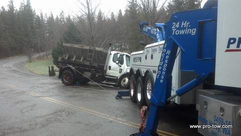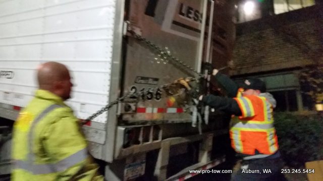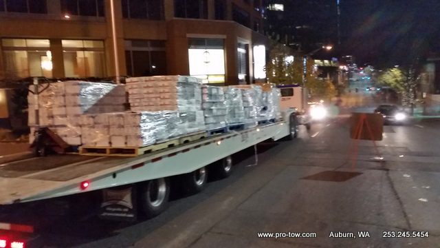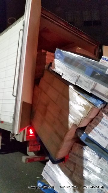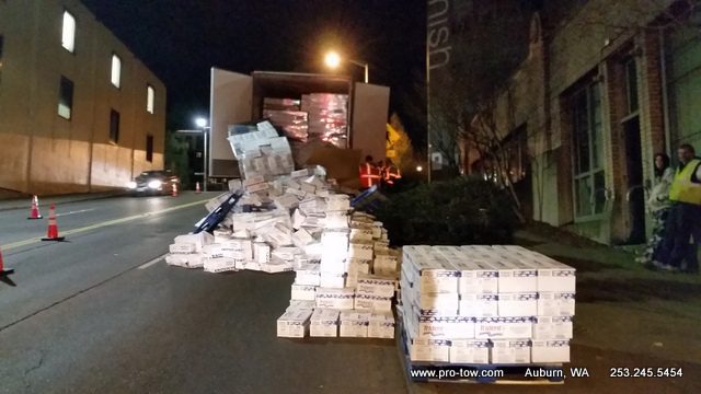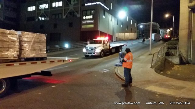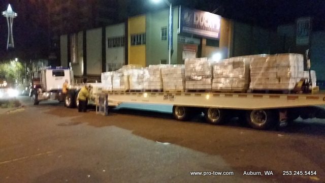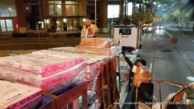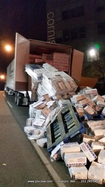 Seafood In Seattle Cargo Recovery & Material Handling by Pro-Tow Auburn, WA. 16 pallets of frozen high value seafood came out of the rear of the trailer in downtown Seattle on an 11% grade, and blocking Denny Way. We quickly and efficiently worked to save nearly 100% of the load throughout the middle of the night. We performed temporary repairs to the trailer doors. We also procured added refer trailers and ensured minimal loss in a very unfortunate emergent situation.