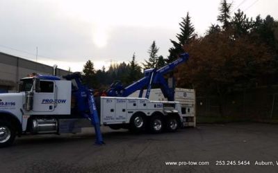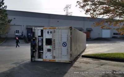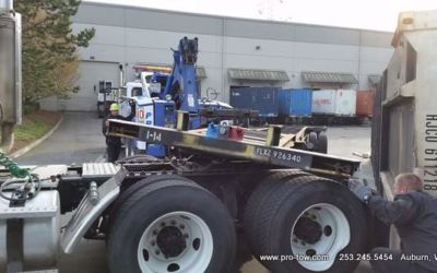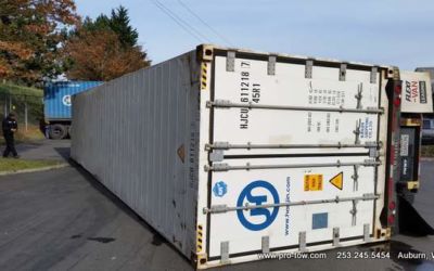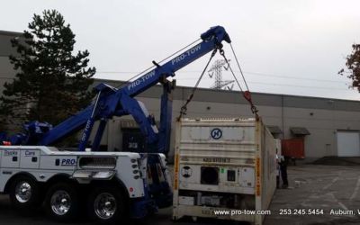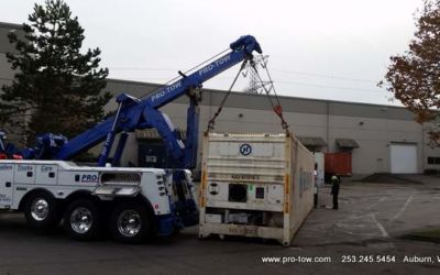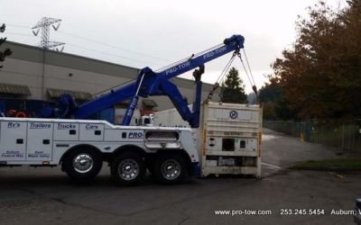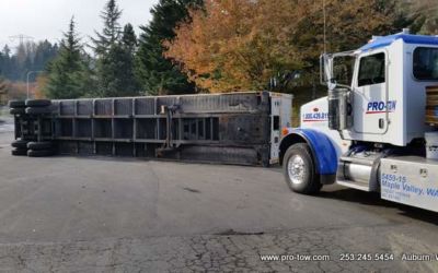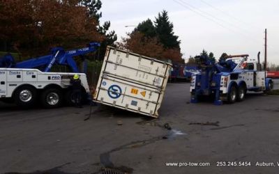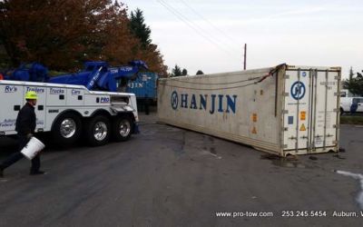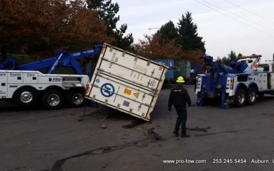 Container Tip Over.  West Valley Highway Auburn, WA  11/18/2014.  Fully loaded with household goods, this trailer came out of the king pin of the tractor and overturned.  The chassis and the container was able to be uprighted successfully with no load loss and no property damage, and without the need for more expensive cranes.