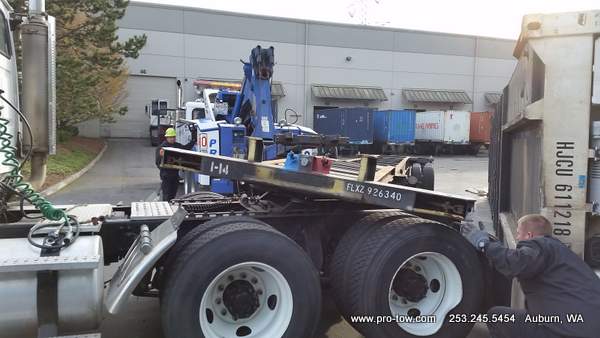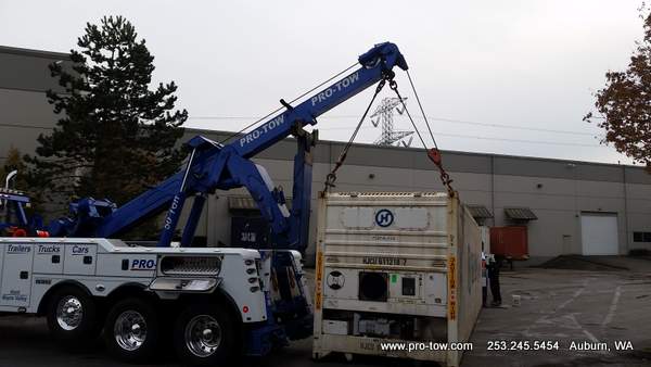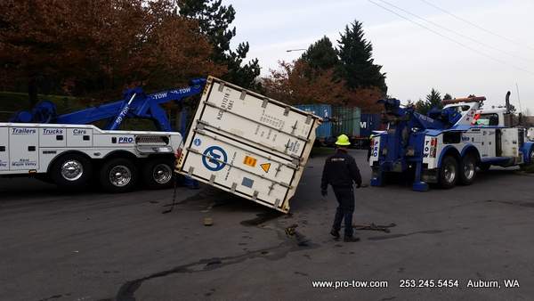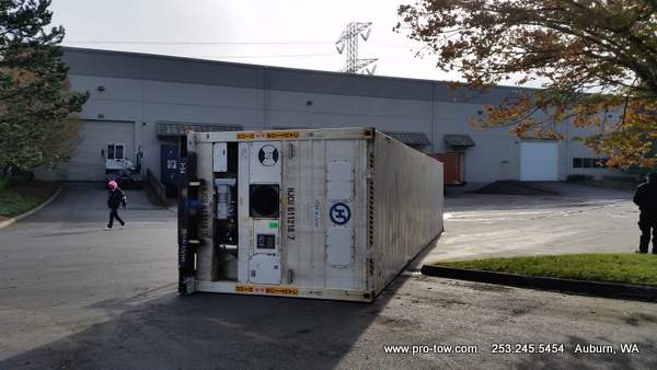 Container Tip Over.  West Valley Highway Auburn, WA  11/18/2014.  Fully loaded with household goods, this trailer came out of the king pin of the tractor and overturned.  The chassis and the container was able to be uprighted successfully with no load loss and no property damage, and without the need for more expensive cranes.