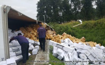 The end dump truck flipped onto its side during rush hour traffic on Interstate 405, north of Bellevue in Kirkland, WA. They required a prompt semi-truck tow service to get the truck back on its wheels and moved, so traffic could start flowing again. Our team provided this service, developing a recovery plan upon arriving at the semi-truck accident and executing it safely and effectively.